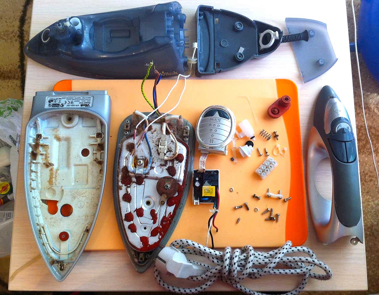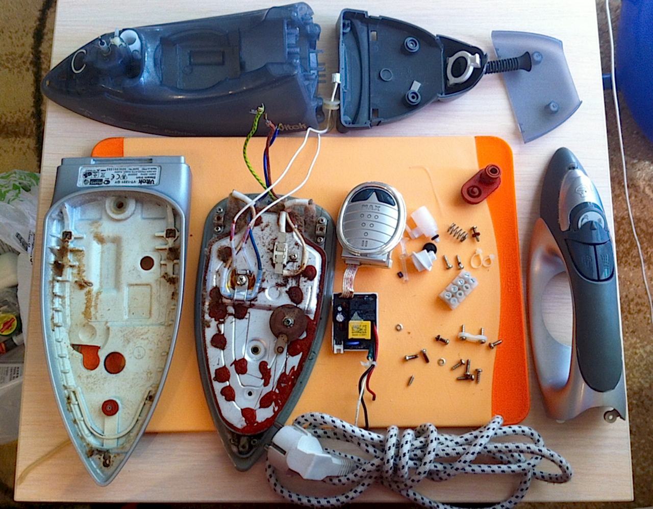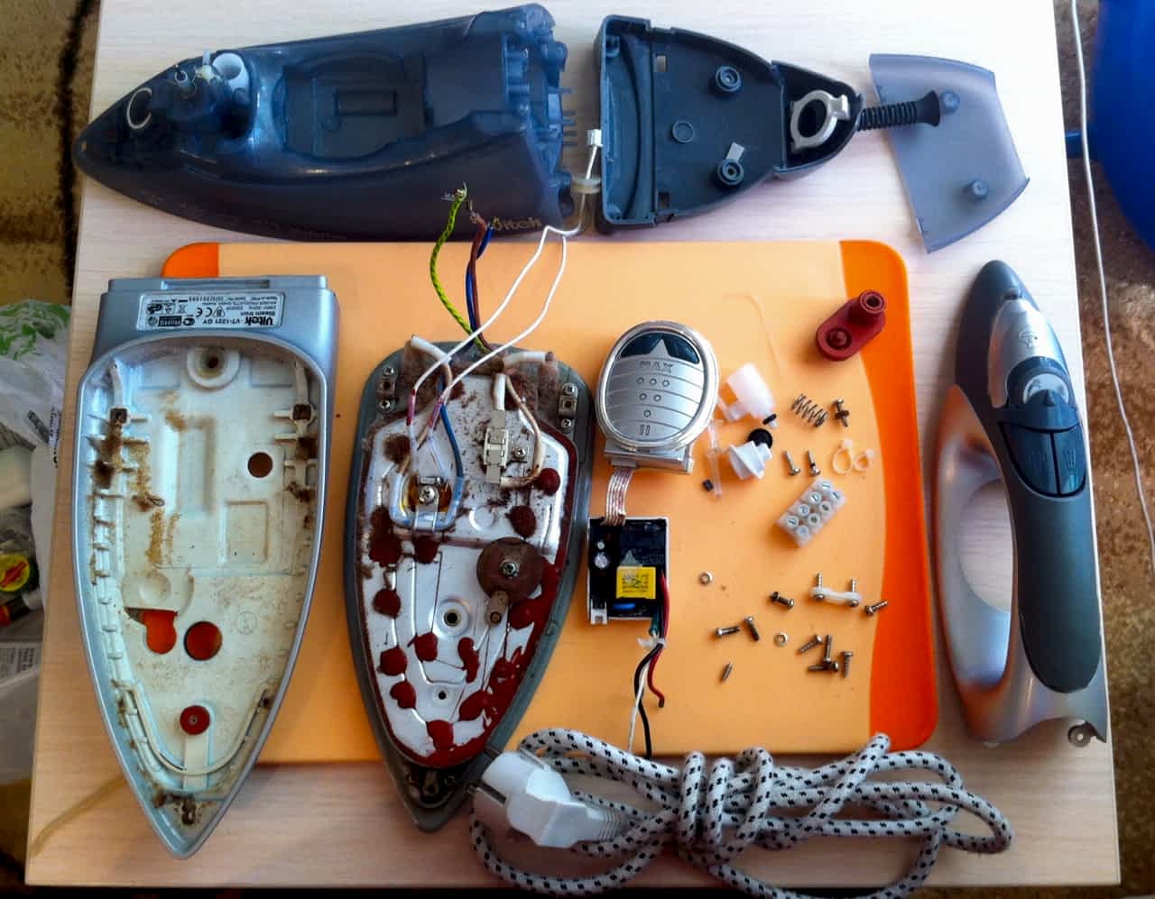 Потребность ремонта утюга может возникнуть из-за обрыва шнура включения в розетку. Повредить его можно, если сильно дернуть устройство, включенное в розетку. Даже учитывая то, что данную работу можно сделать собственноручно, лучше не вскрывать электроприбор, не имея требуемого опыта. Во время ремонта вы можете не только не поменять шнур, но и сломать термостат с регулятором температуры. Кстати, последние тоже выходят из строя в результате короткого замыкания или повышения напряжения в сети. Во время ремонта потребуется не только сделать замену переставшего функционировать электронного компонента, но и правильно сделать его подборку, на что необходимы соответствующие знания.